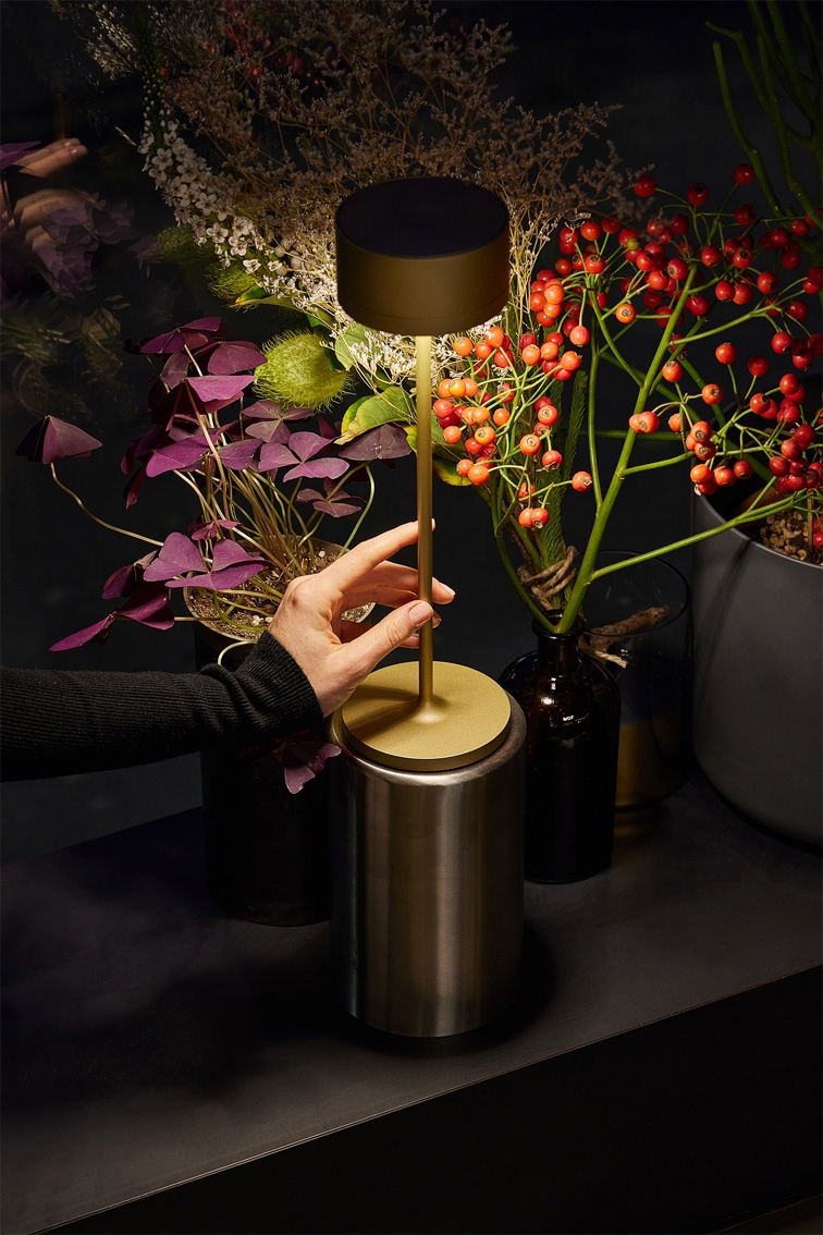 Elegancka lampa stołowa nadaje się do użytku zewnętrznego dzięki klasie IP 65, a baza ładująca z kablem i portem USB jest dołączona do zestawu, co umożliwia łatwe ładowanie lampy.