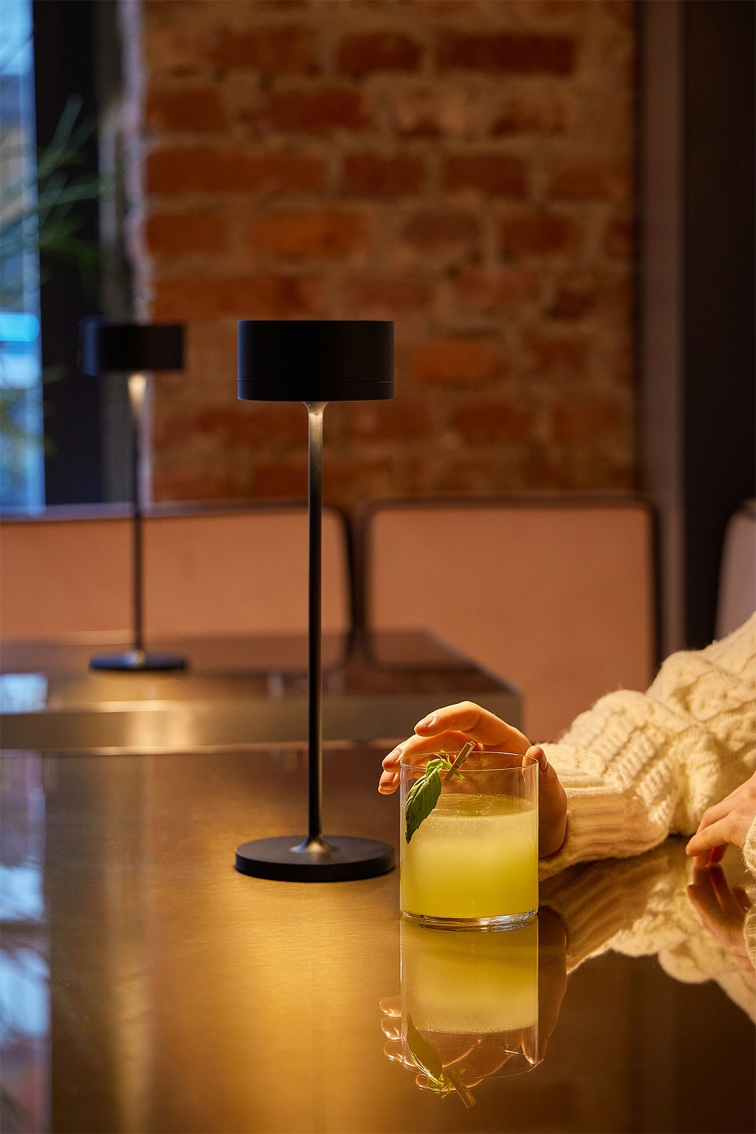 Elegancka lampa stołowa jest odpowiednia do użytku na zewnątrz dzięki klasie IP 65, a baza ładująca z kablem i portem USB jest dołączona do zestawu, co umożliwia łatwe ładowanie lampy.