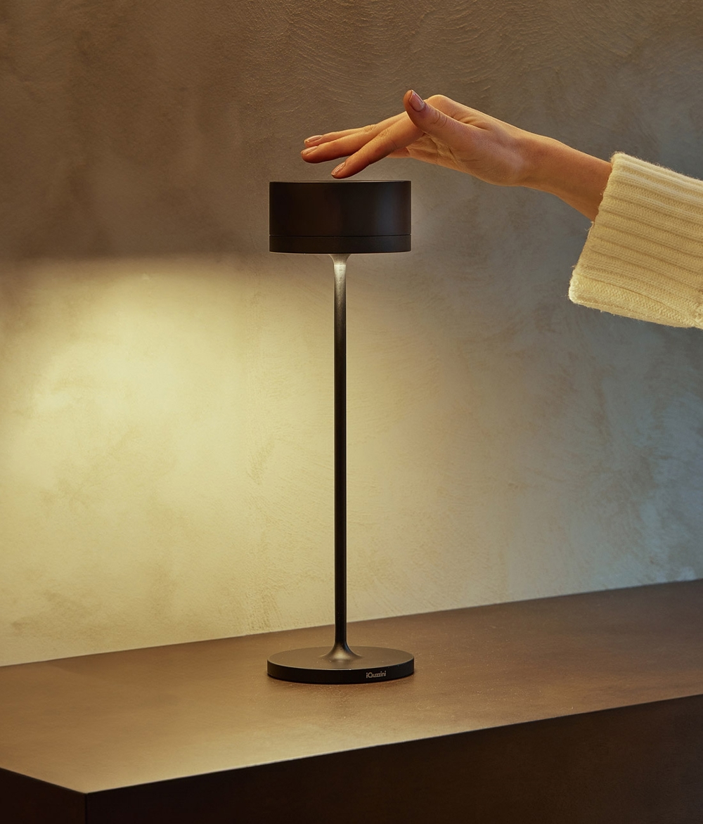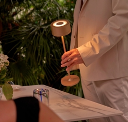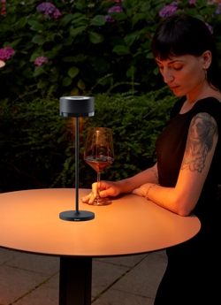 Elegancka lampa stołowa nadaje się do użytku na zewnątrz dzięki klasie IP 65, a baza ładująca z kablem i portem USB jest dołączona do zestawu, co ułatwia ładowanie lampy.