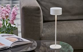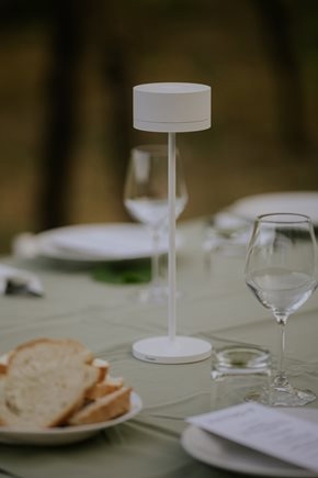 Elegancka lampa stołowa nadaje się do użytku zewnętrznego dzięki klasie IP 65, a baza ładująca z kablem i portem USB jest dołączona do zestawu, co umożliwia łatwe ładowanie lampy.