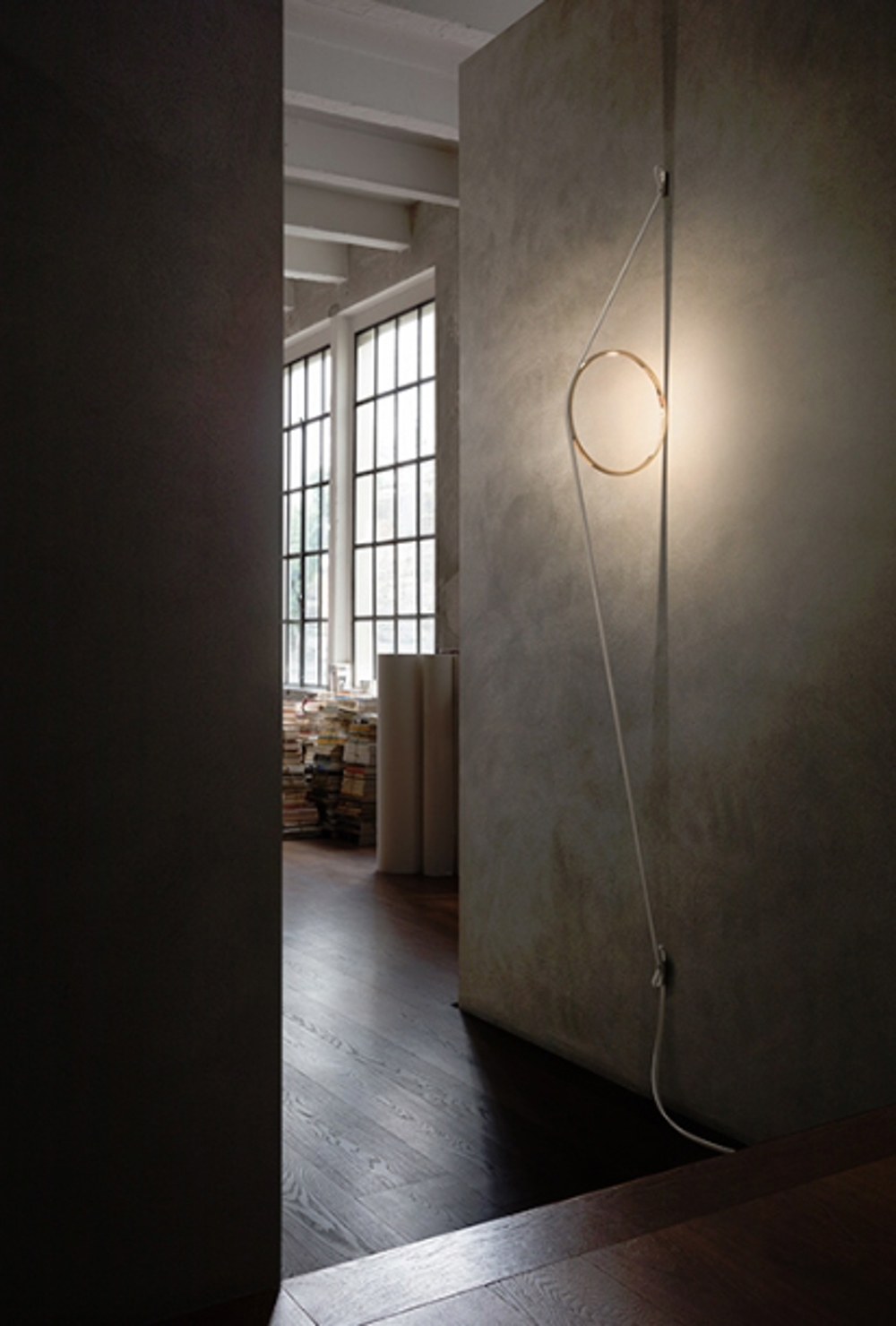 Wirering Kinkiet z szarym przewodem i złotym pierścieniem – zaprojektowany przez Formafantasma dla Flos w 2018 roku.