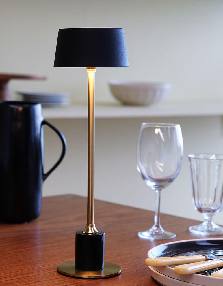 Przenośna lampka stołowa Yoyo jest idealna na parapet i inne miejsca z ograniczoną przestrzenią. Lampa bateryjna może również stać w grupie na stole jadalnym jako stylowy element dekoracyjny. Klosz wykonany jest z czarnego szczotkowanego metalu, podstawa i trzon lampy są z mosiądzu, a baza z marmuru.